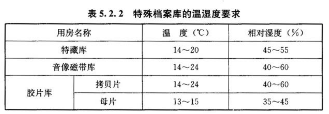 根據《檔案館建筑設計規范》JGJ-25-2010的有關規定,特藏庫、音像磁帶庫、膠片庫等特殊檔案庫的溫濕度要求應符合下表要求: